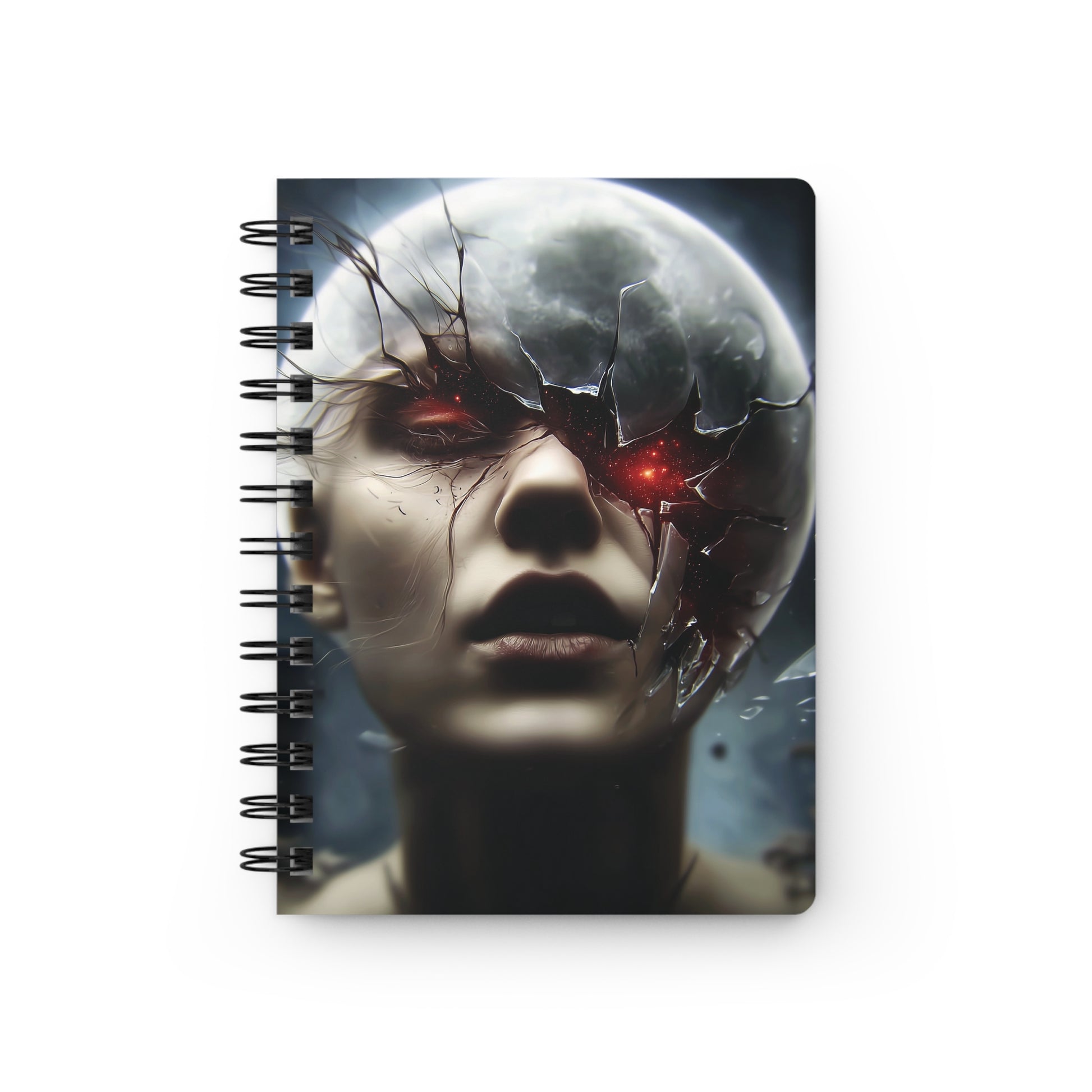 Préparez-vous à une explosion visuelle d'horreur cosmique et de beauté déroutante. Ce gros plan intense montre un visage féminin dont le front se fissure comme de la glace, révélant la pleine Lune derrière. La fracture est béante, et derrière la Lune brisée, deux yeux rouges ardents et stellaires émergent, projetant une lumière menaçante. Ce design puissant capture l'instant où l'humain et le divin cosmique entrent en collision. C'est le choix idéal pour les amateurs de dark fantasy, de science-fiction sombre, d'art horrifique stylisé et de l'esthétique du chaos stellaire.