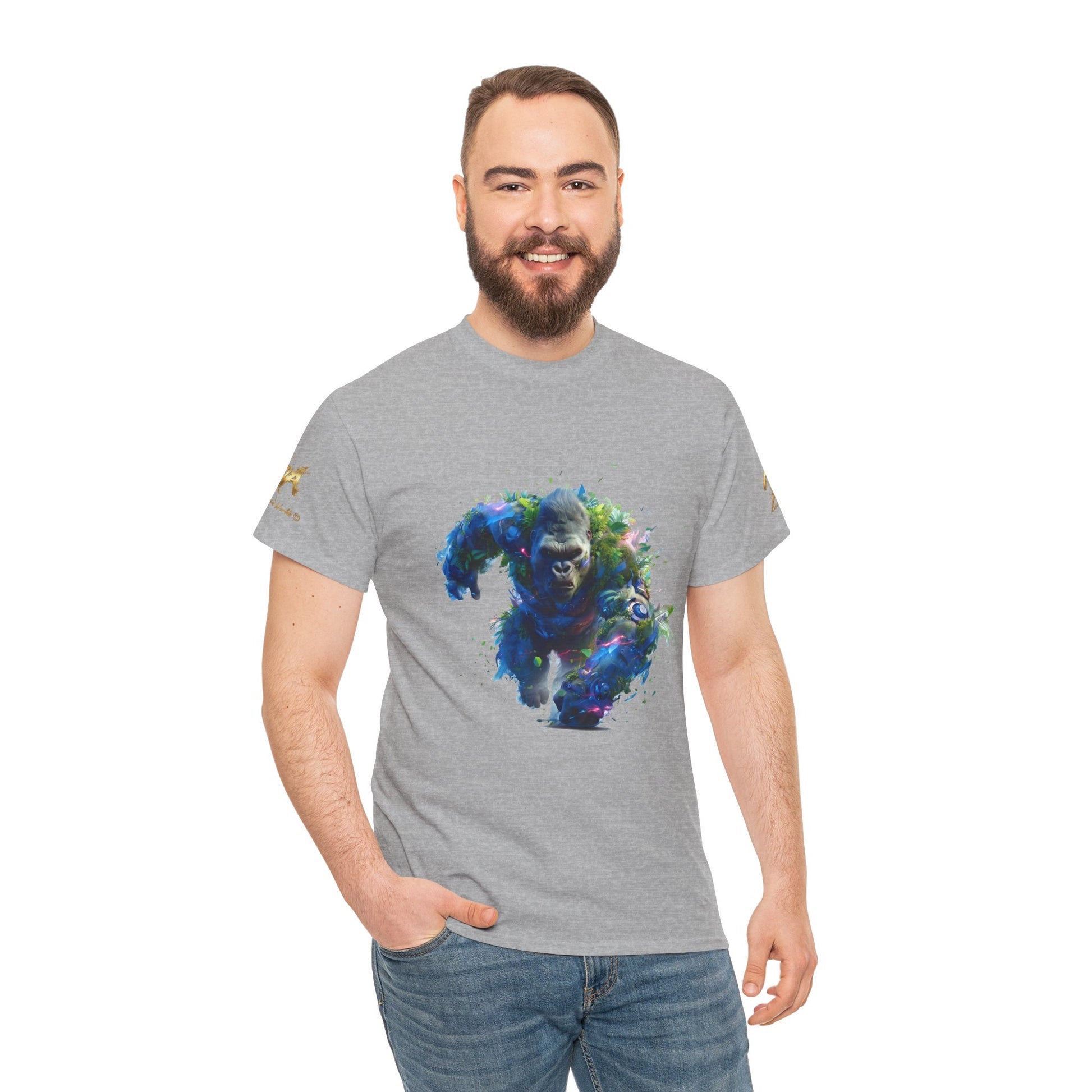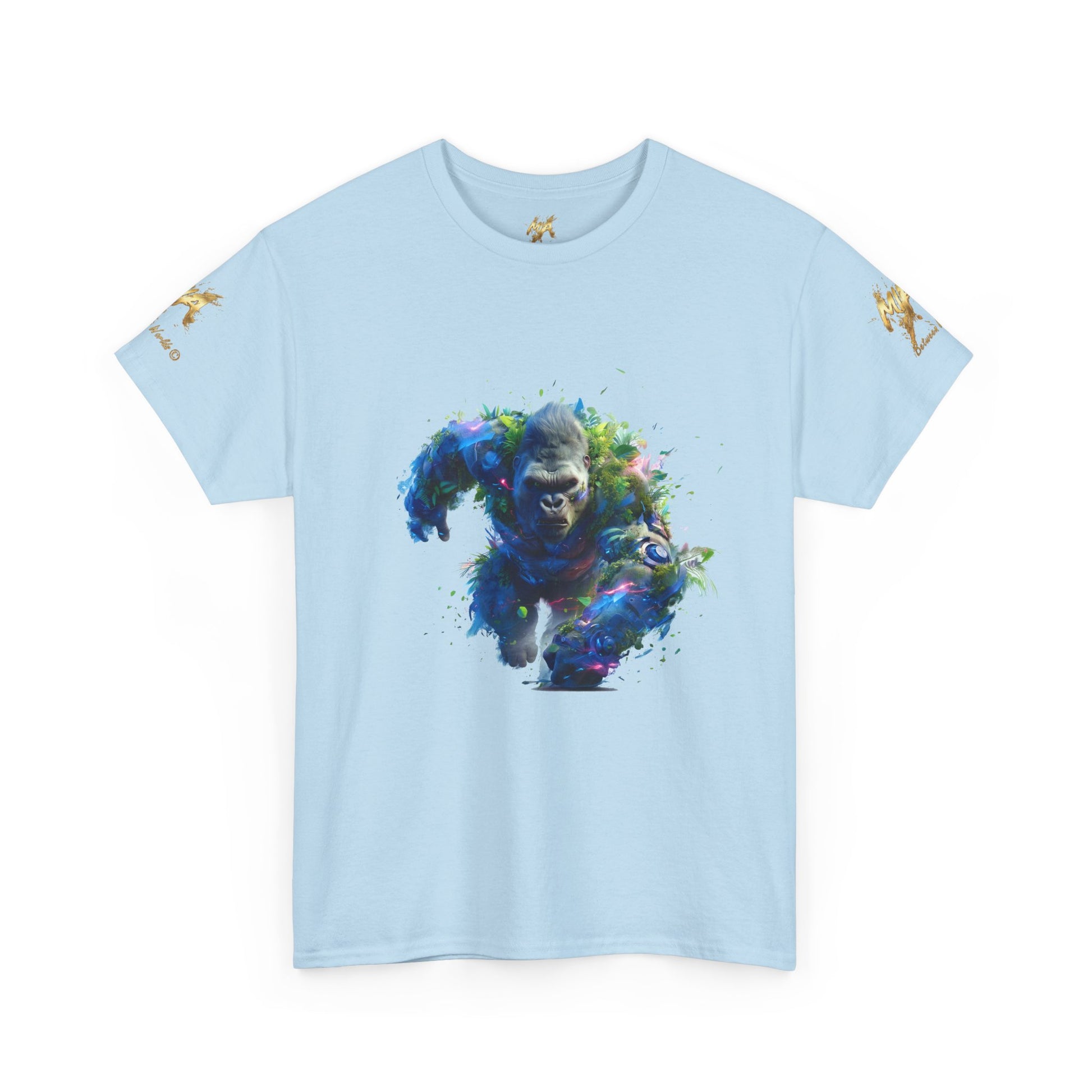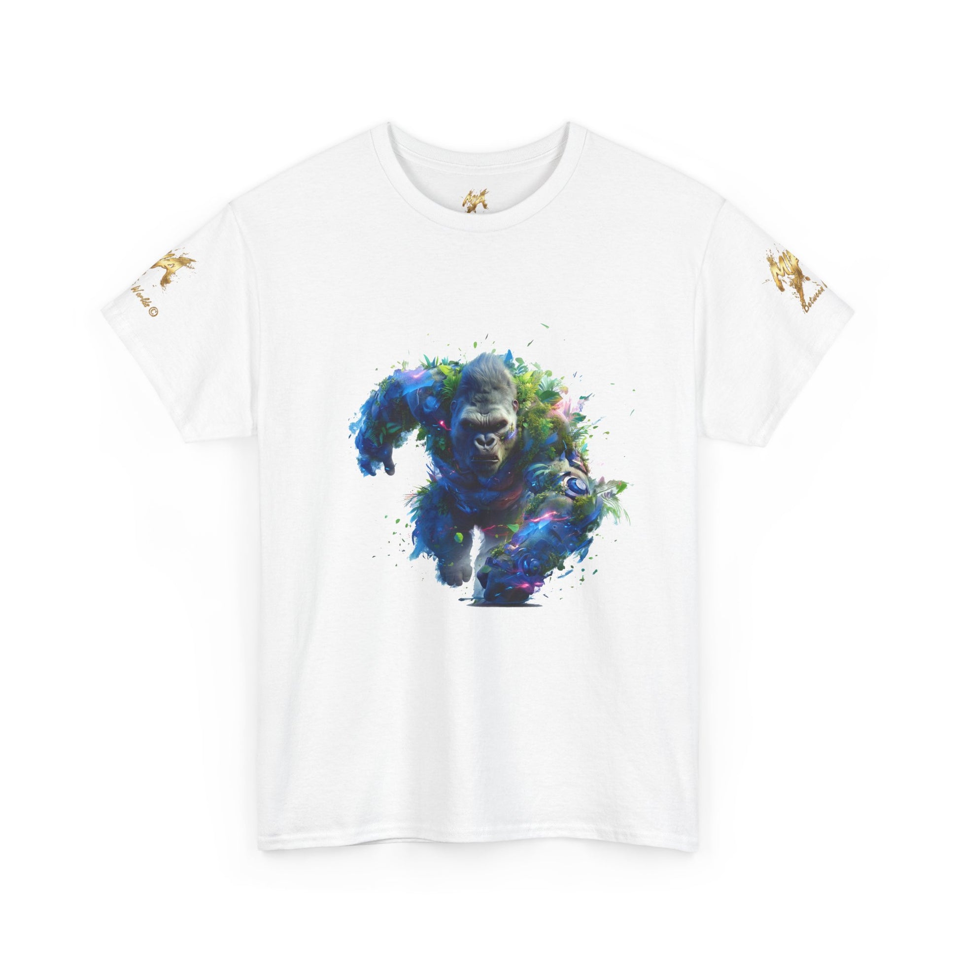 Assistez à la puissance du Gorille Titan, une illustration explosive générée par IA qui capture l'énergie brute de la nature. Ce gorille est représenté en pleine charge, son corps massif est une fusion spectaculaire de fourrure sombre, de feuillage tropical dense et de fragments d'éléments mécaniques et lumineux. Des éclairs de lumière bleue et magenta s'échappent de son corps, suggérant une force électrisante et surnaturelle. Le mélange de la biologie luxuriante et de la technologie fragmentée confère à cette œuvre une esthétique biopunk et fantastique unique. Le regard intense du gorille exprime une détermination inébranlable. Parfait pour les fans d'art conceptuel, de créatures puissantes, d'art de la jungle et des designs avec un fort impact visuel. Un excellent choix pour les posters, les t-shirts à fond sombre et les accessoires.