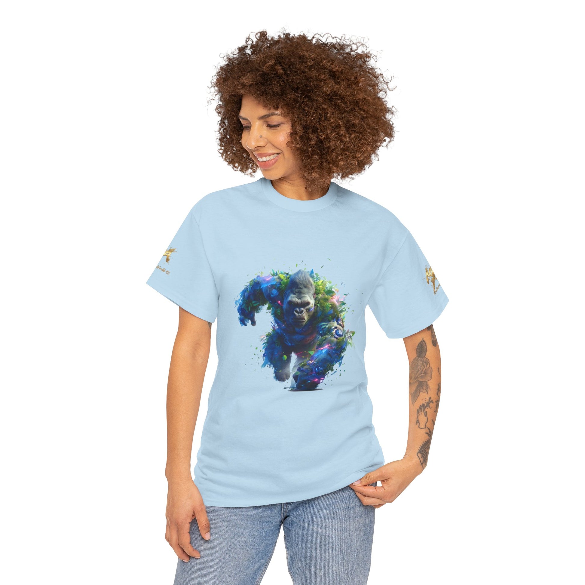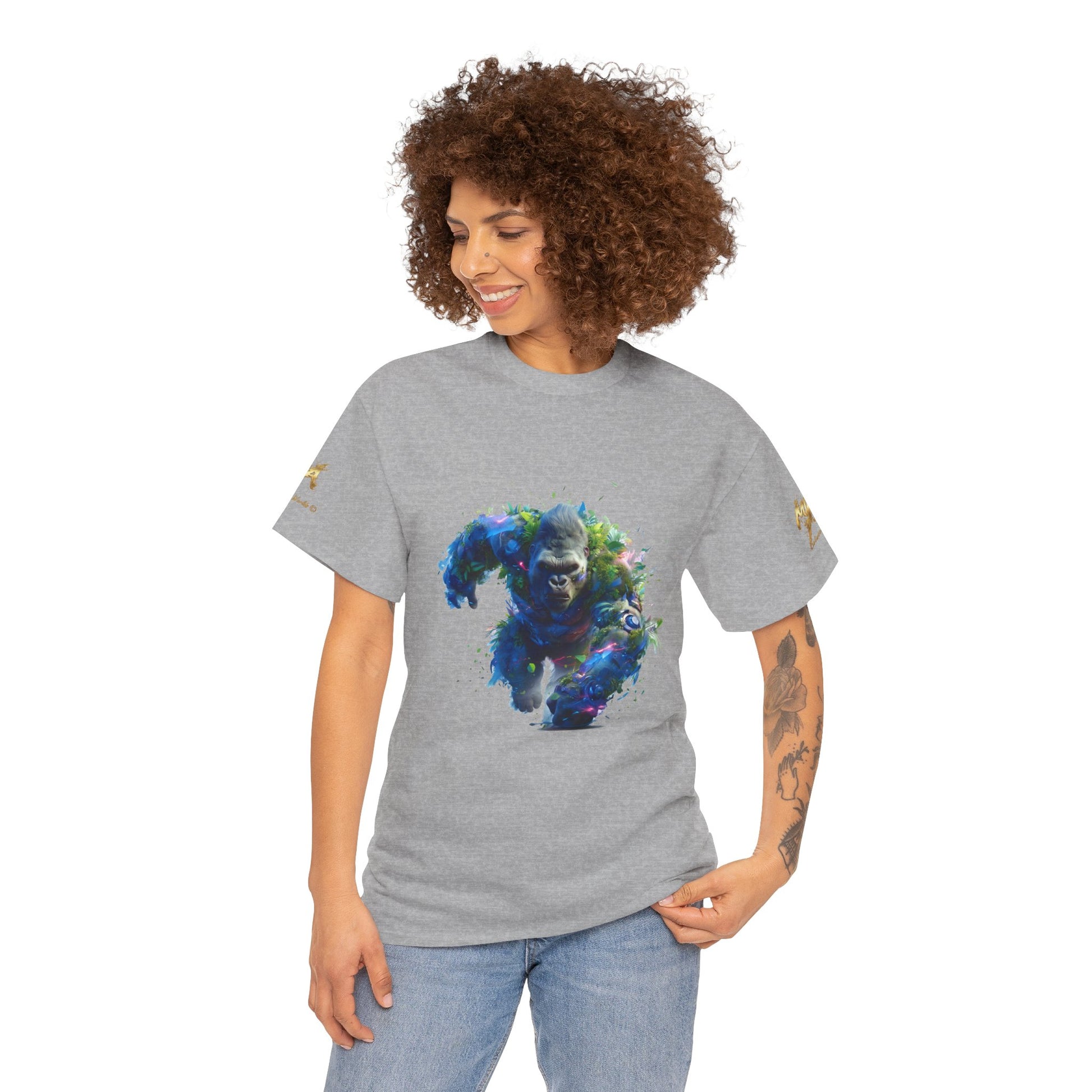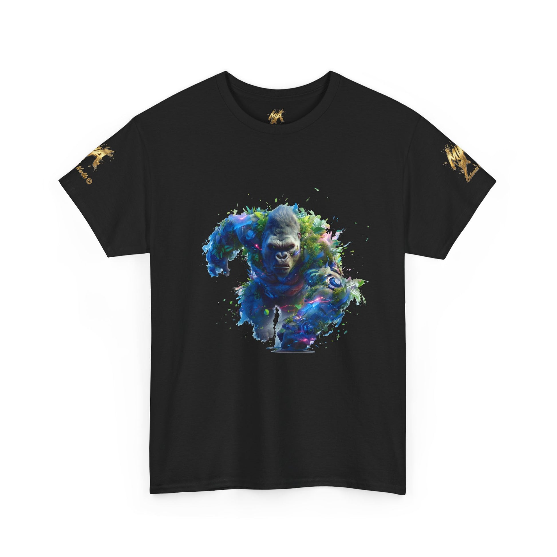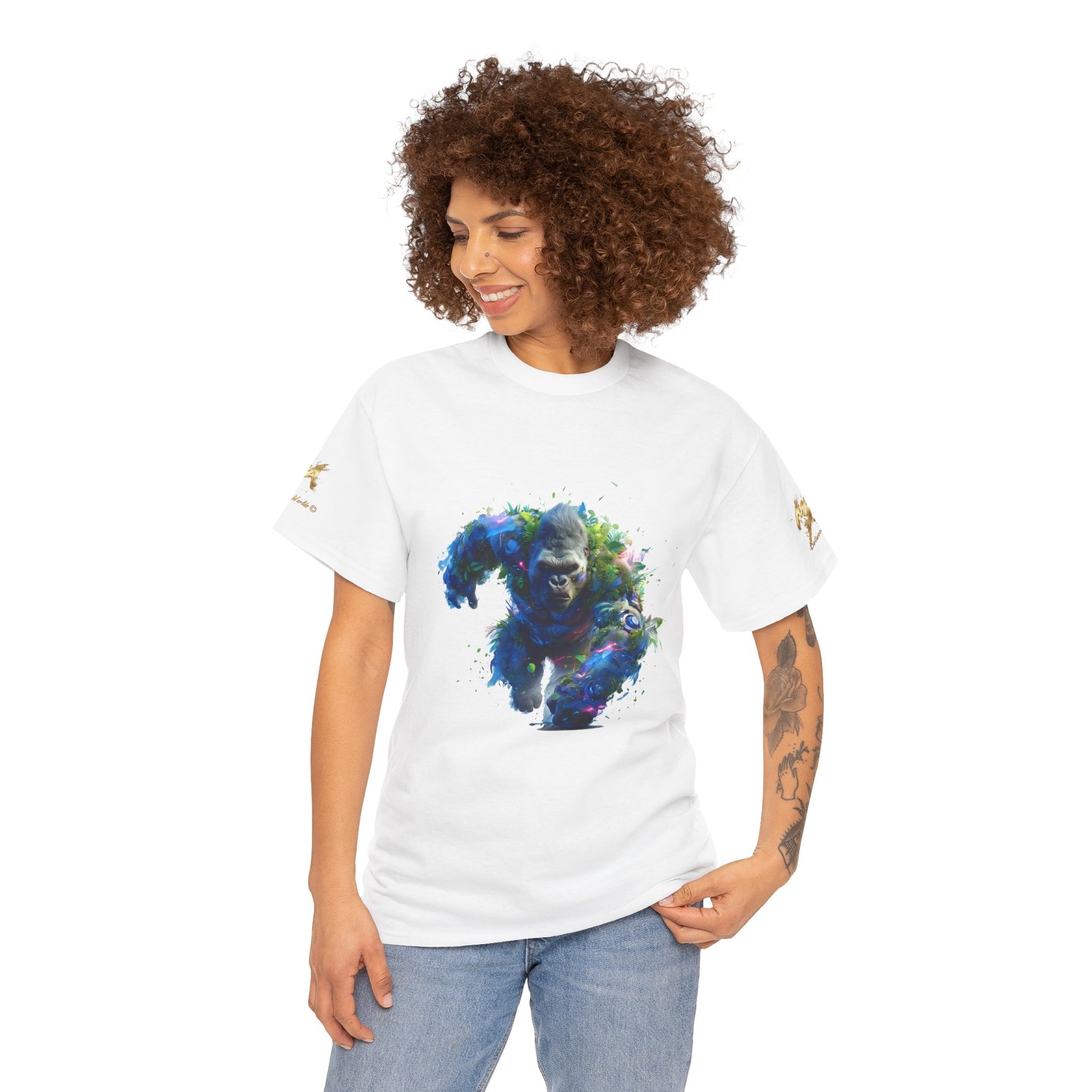 Assistez à la puissance du Gorille Titan, une illustration explosive générée par IA qui capture l'énergie brute de la nature. Ce gorille est représenté en pleine charge, son corps massif est une fusion spectaculaire de fourrure sombre, de feuillage tropical dense et de fragments d'éléments mécaniques et lumineux. Des éclairs de lumière bleue et magenta s'échappent de son corps, suggérant une force électrisante et surnaturelle. Le mélange de la biologie luxuriante et de la technologie fragmentée confère à cette œuvre une esthétique biopunk et fantastique unique. Le regard intense du gorille exprime une détermination inébranlable. Parfait pour les fans d'art conceptuel, de créatures puissantes, d'art de la jungle et des designs avec un fort impact visuel. Un excellent choix pour les posters, les t-shirts à fond sombre et les accessoires.