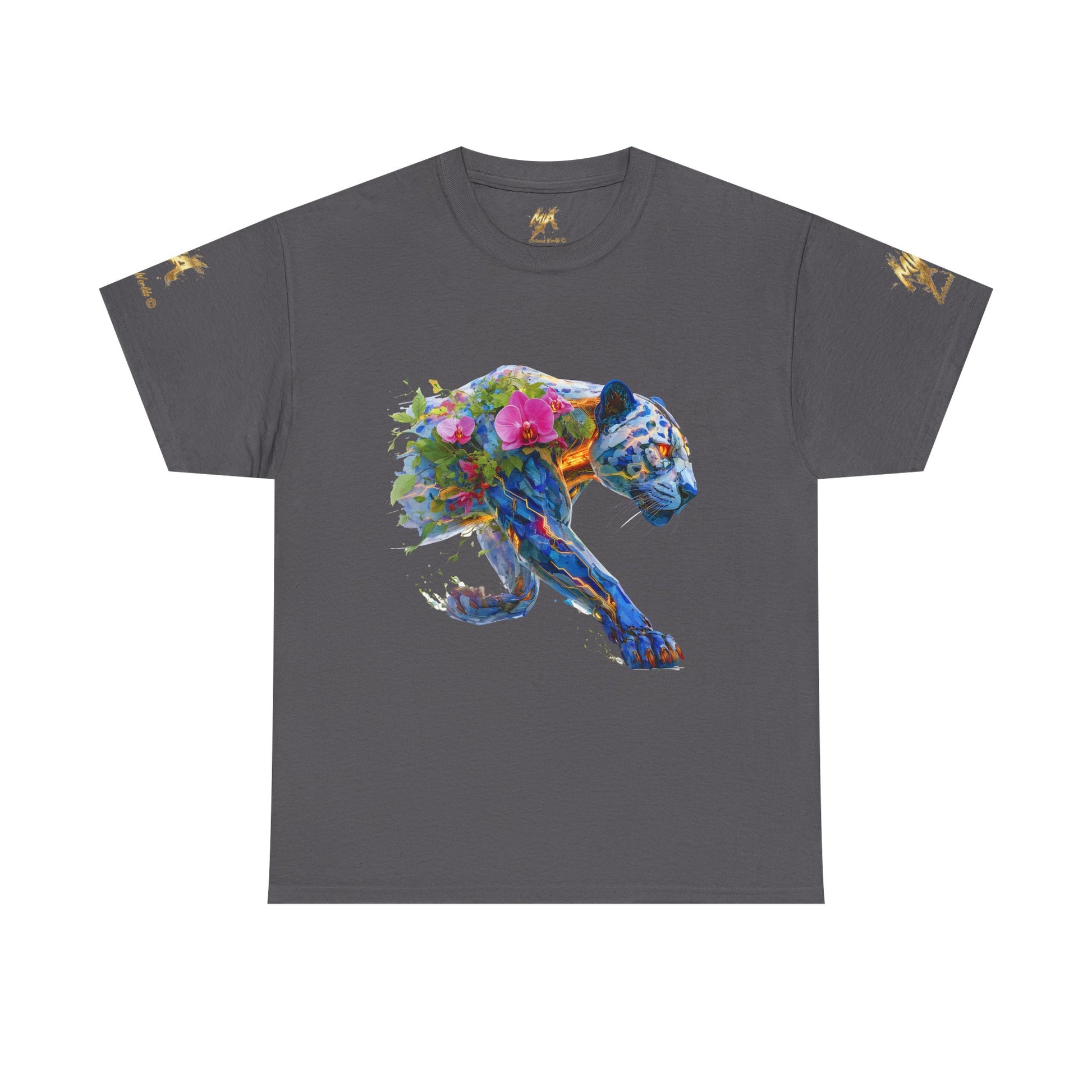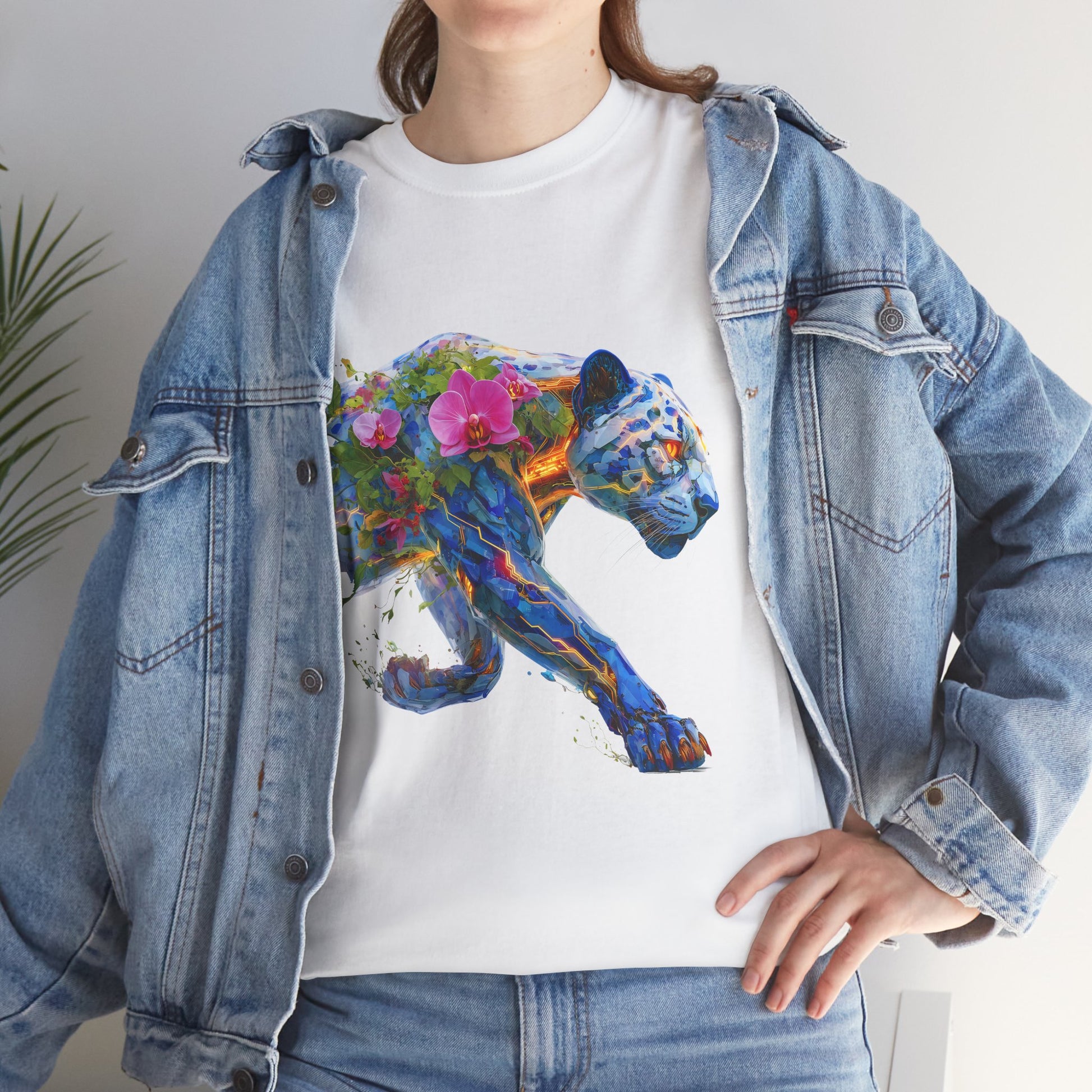 Admirez ce Jaguar Mécano-Botanique, une œuvre d'art numérique IA qui explore la symbiose entre la haute technologie et la nature luxuriante. La panthère majestueuse est représentée avec une armure facettée et des circuits lumineux en bleu vibrant et orangé. Son dos et son flanc sont envahis par une végétation exubérante, dont de splendides orchidées roses et des feuilles tropicales, fusionnant l'énergie brute de la jungle avec la complexité de la cybernétique. Les yeux brillants et la pose furtive capturent l'esprit puissant et discret de ce prédateur. Ce design éclectique et coloré est parfait pour ceux qui aiment le biopunk, les créatures fantastiques et l'art qui mélange les éléments organiques et mécaniques. Idéal pour les tote bags, les stickers et l'habillement.