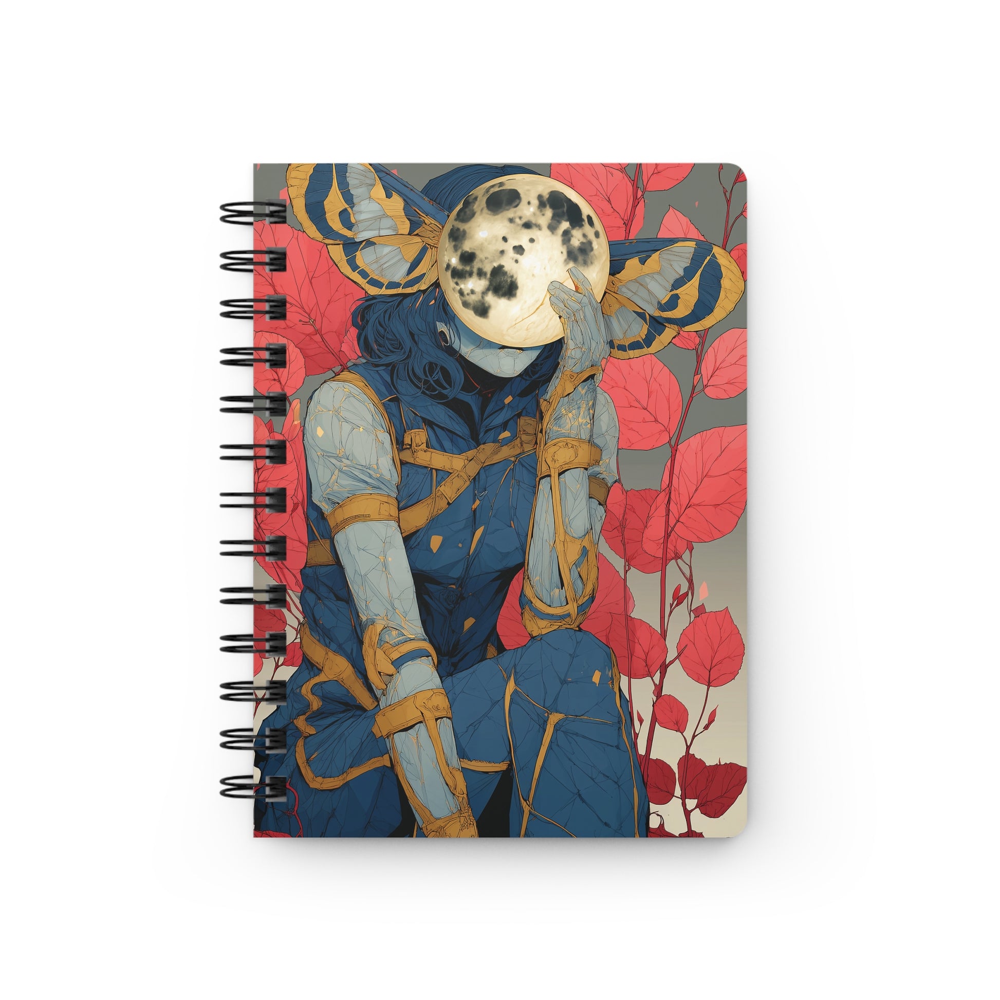Plongez dans un monde de couleurs contrastées et d'émotions silencieuses avec cette illustration stylisée. Elle dépeint une figure féminine vêtue d'une tenue structurée et géométrique aux tons de bleu foncé et jaune moutarde. Le visage est masqué par une pleine lune texturée, que la figure tient pensivement d'une main. Les ailes d'un papillon de nuit géant dans les mêmes tons bleus et jaunes encadrent la tête, tandis que des feuilles d'un rouge intense créent un contraste frappant et dramatique avec le bleu froid. Ce design est parfait pour les amateurs d'art moderne, de symbolisme, de mélancolie chic et de l'esthétique du contre-jour lunaire. Idéal pour un public attiré par les œuvres de fantasy urbaine et les illustrations audacieuses.