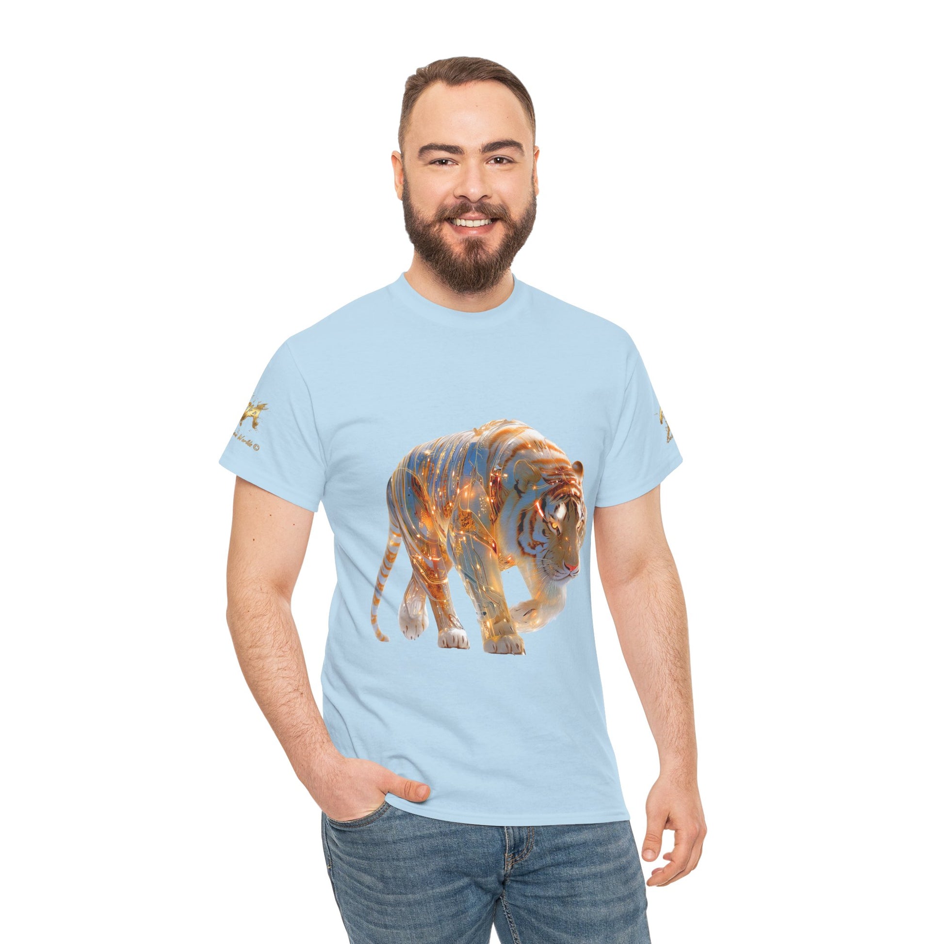 Cette illustration numérique spectaculaire fusionne la puissance majestueuse du tigre blanc avec la complexité du design cybernétique. L'animal est représenté avec des circuits imprimés dorés incrustés sous sa fourrure, émettant une lumière chaude qui contraste avec les tons blancs et bleutés. Ce tigre cyborg symbolise la rencontre entre la nature sauvage et l'intelligence artificielle. Son regard intense et sa démarche assurée en font une œuvre percutante et futuriste. Idéale pour les amateurs de science-fiction, de thèmes cyberpunk, d'animaux majestueux et d'art qui explore la relation entre l'organique et le technologique.